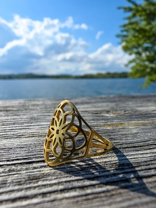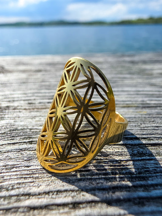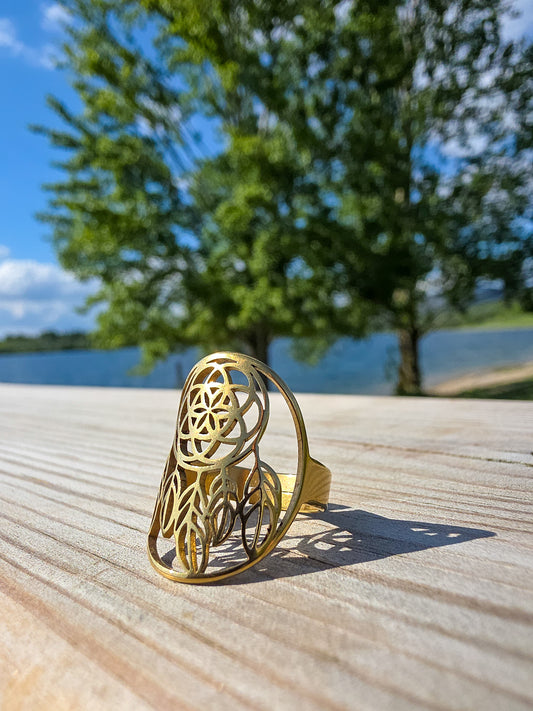 ANILLO ACERO INOXIDABLE CHAPADO EN ORO | FLOR DE LA VIDA | AJUSTABLE