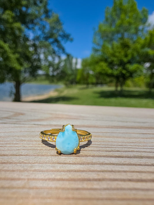 ANILLO DE LARIMAR CALIDAD EXTRA EN PLATA BAÑADA EN ORO | AJUSTABLE